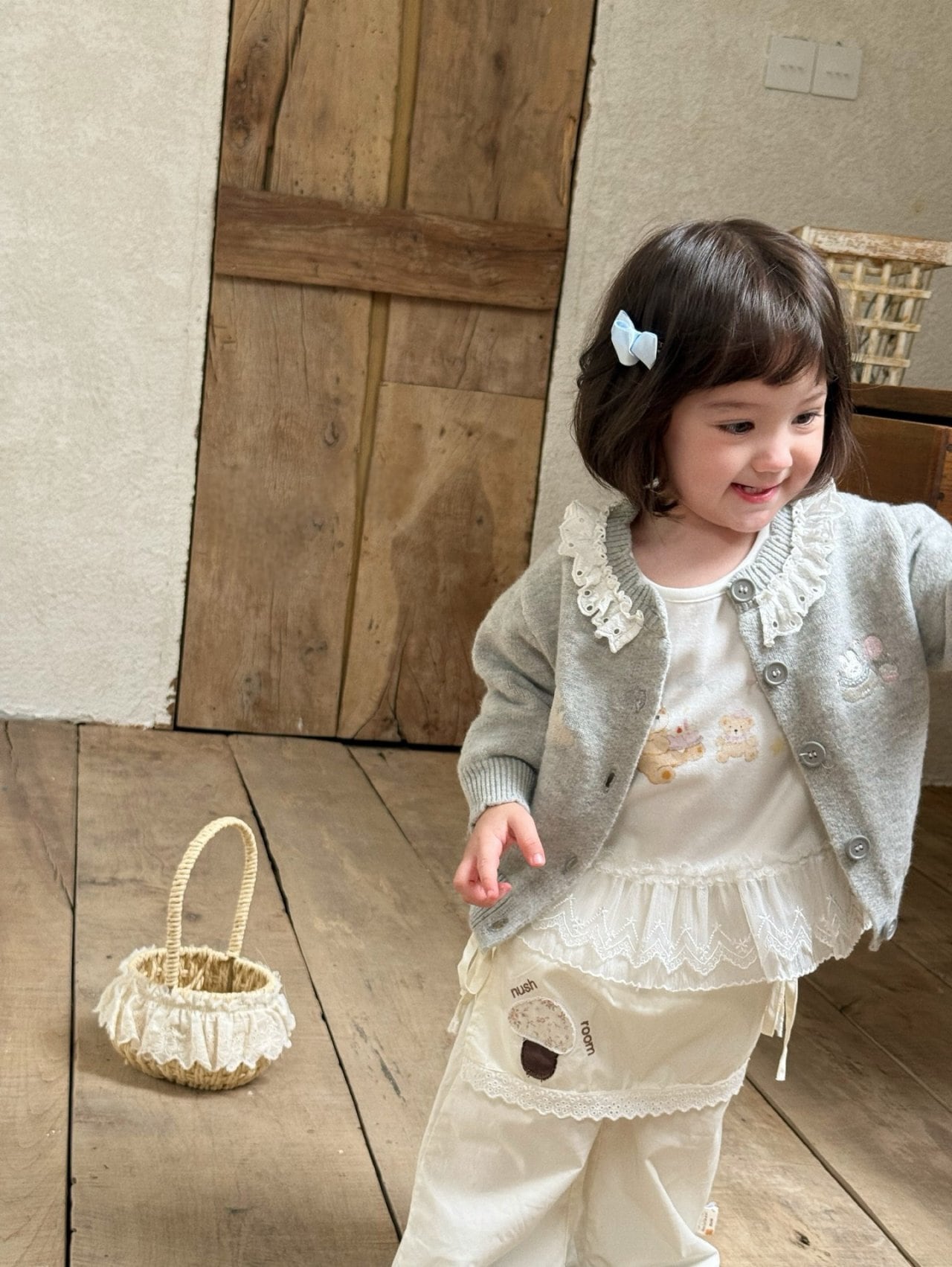 くまさんプリントの色合いにもこだわられた淡い印象のロンT